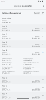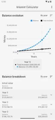 Getting started with the "Basic Mode" is easy: Just input the initial amount of money (if any), an optional monthly deposit, the interest rate and how much time you are planing to keep your capital invested. This app will then show you all the information you need in a beautiful graph, accompanied by a detailed analysis for the selected period.