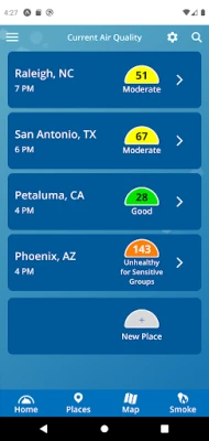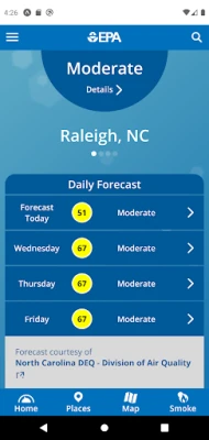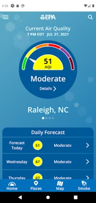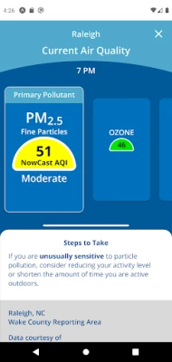 The app will allow users to get location-specific reports on current air quality and air quality forecasts for both ozone and fine particle pollution (PM2.5). Air quality maps from the AIRNow website provide visual depictions of current and forecast air quality nationwide, and a page on air quality-related health effects explains what actions people can take to protect their health at different AQI levels, such as “code orange.”