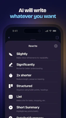 • NO losing ideas and their details due to lack of time for writing them down Just SPEAK. AI writing is easier. It's like your personal voice AI writer.