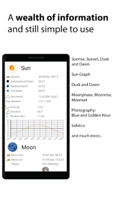 ⭐The Main View displays all the detailed information: sunrise/sunset, moonrise/moonset, blue hour, golden hour, solar noon, twilight times, moon phase, and much more.